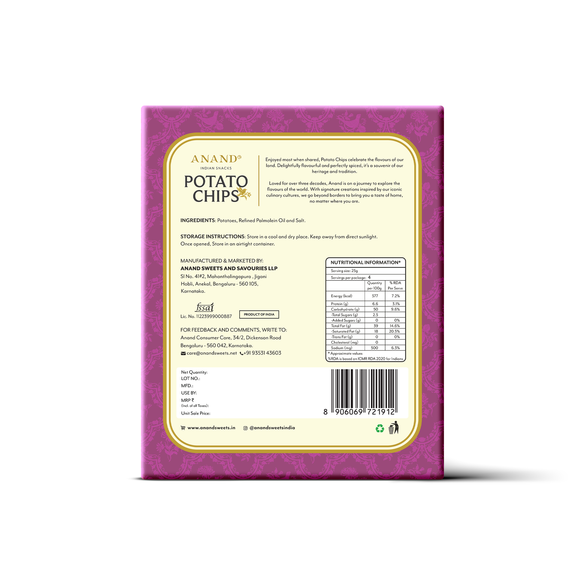 The thinly-sliced Potato Chips from Anand Sweets are made using the best quality vegetable and sprinkled with fine-ground black salt and common salt for a truly home-style version of the beloved classic. Get ready for an addictive experience as you open the packet. Have it with your meals or make it a party staple.
