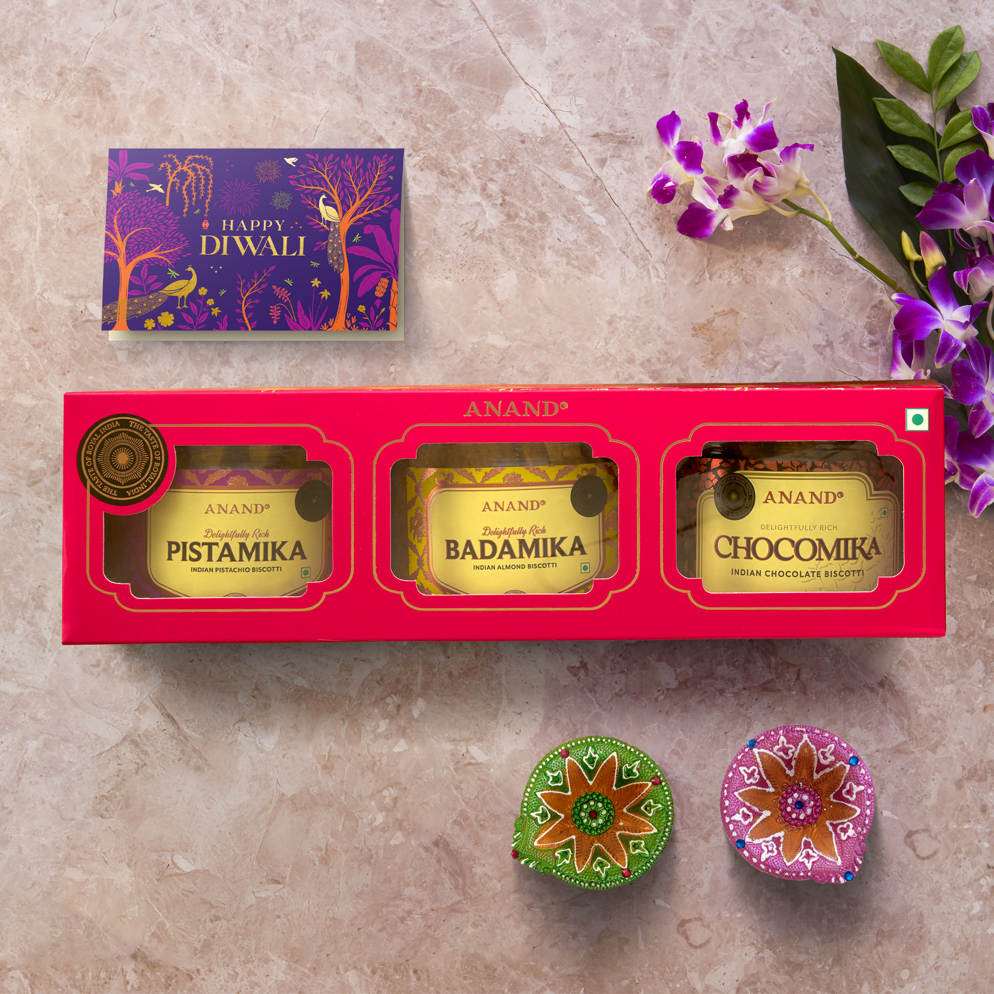 Indulge in the heavenly trio of premium biscotti creations from the renowned sweet-making experts at Anand Sweets. Each of these delectable treats is an original creation, boasting a unique Indian twist on the classic Italian biscotti. This perfect trio pack features Badamika - a crispy square of refined flour generously sprinkled with chunky almond pieces; Pistamika - a crunchy, sweet biscuit made with fiber and protein-rich Iranian pistachios; and Chocomika - a chocolatey, nutty delight made with utmost care in their state-of-the-art sweet-making facility.