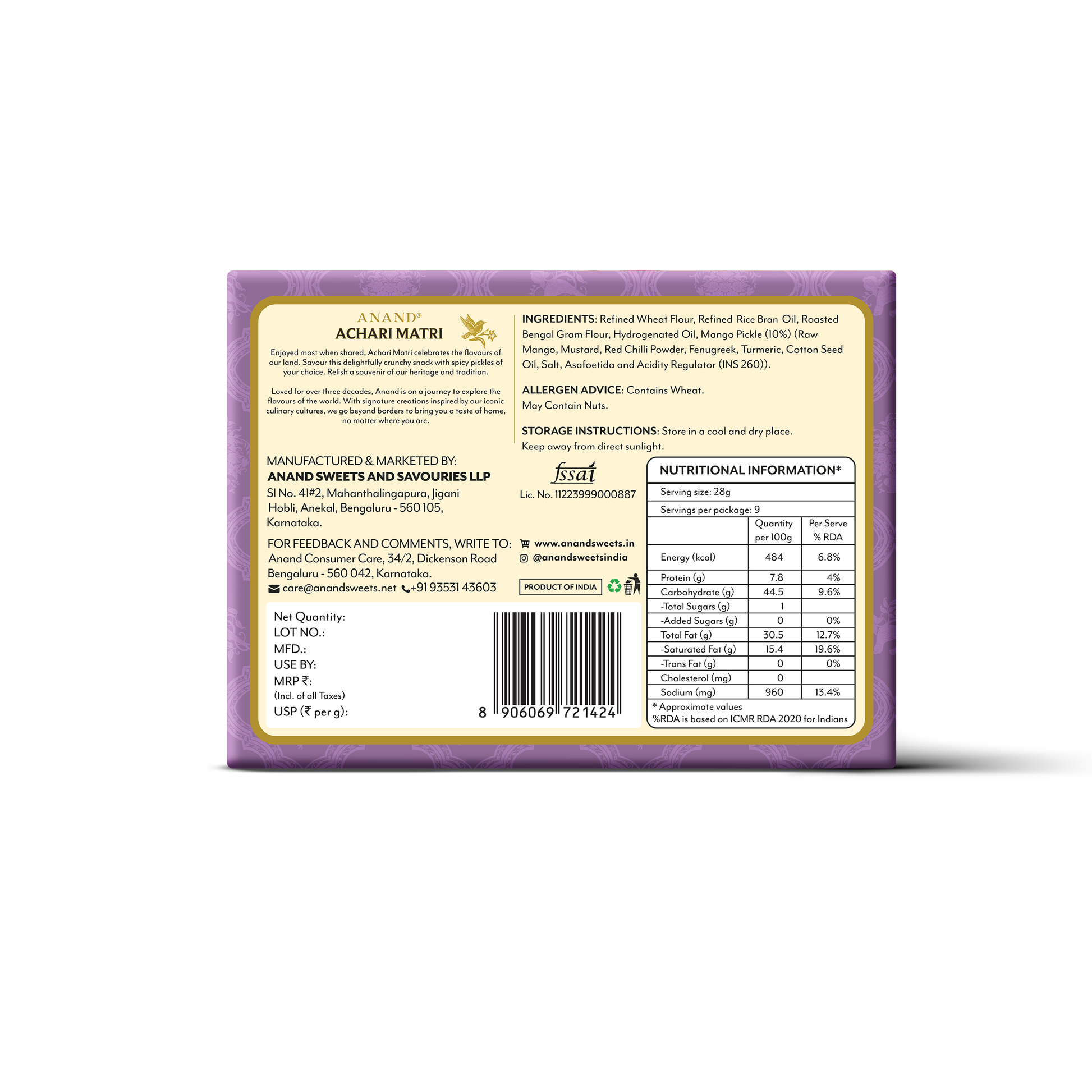 Flavoured with tangy mango powder and a fragrant mix of ginger, aniseed or saunf, and select spices, the Anand Sweets Achari Matri brings you a medley of zesty flavours. Super fresh and non-greasy, the delicious snack may be had by itself or be paired with pickles of choice for extra zing. Perfect to be served along with your favourite sweets.