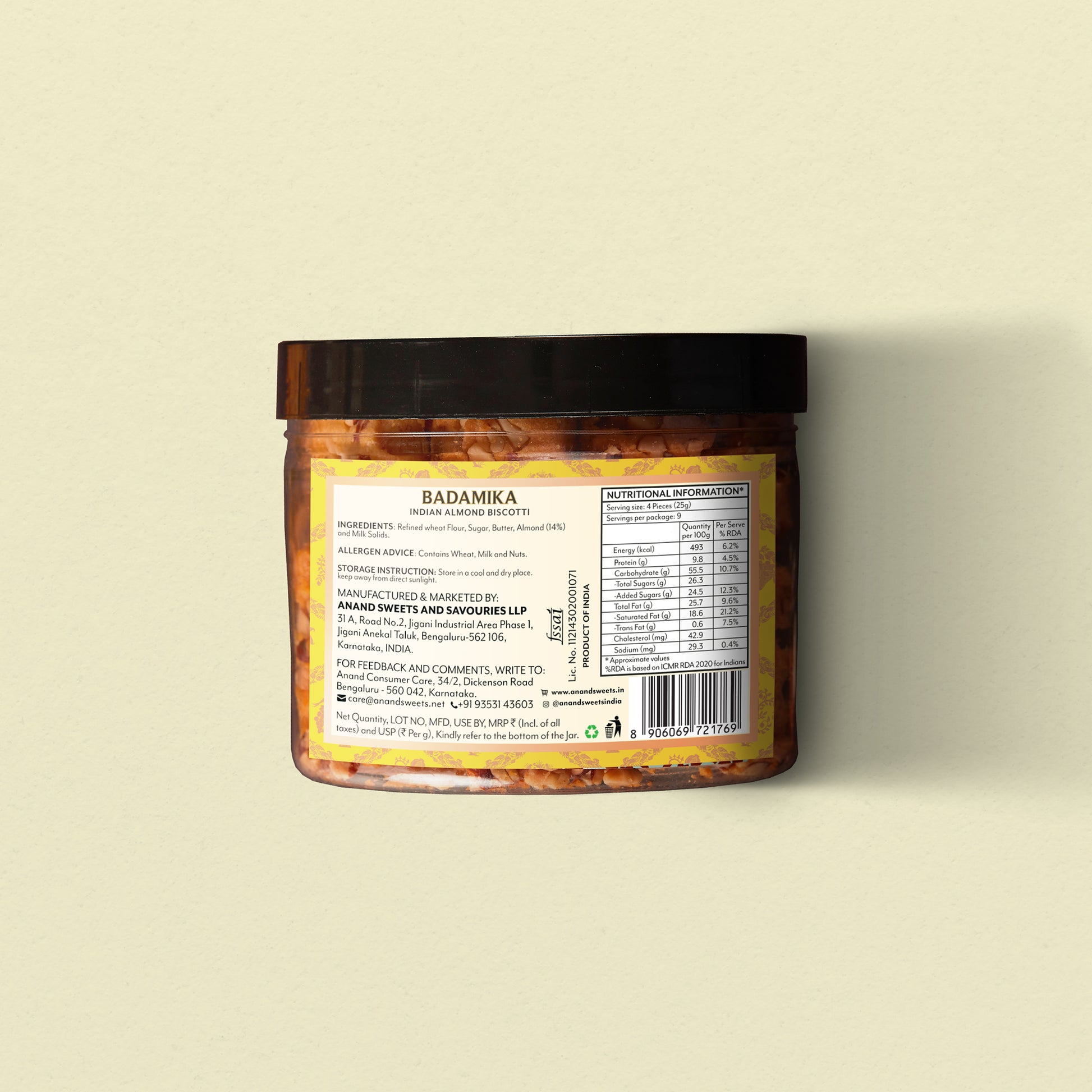 Anand Sweets Badamika comes in an attractive recyclable plastic jar. The baked biscuits have a shelf life of 6 months. Store the jar in a cool, dry place away from direct sunlight.