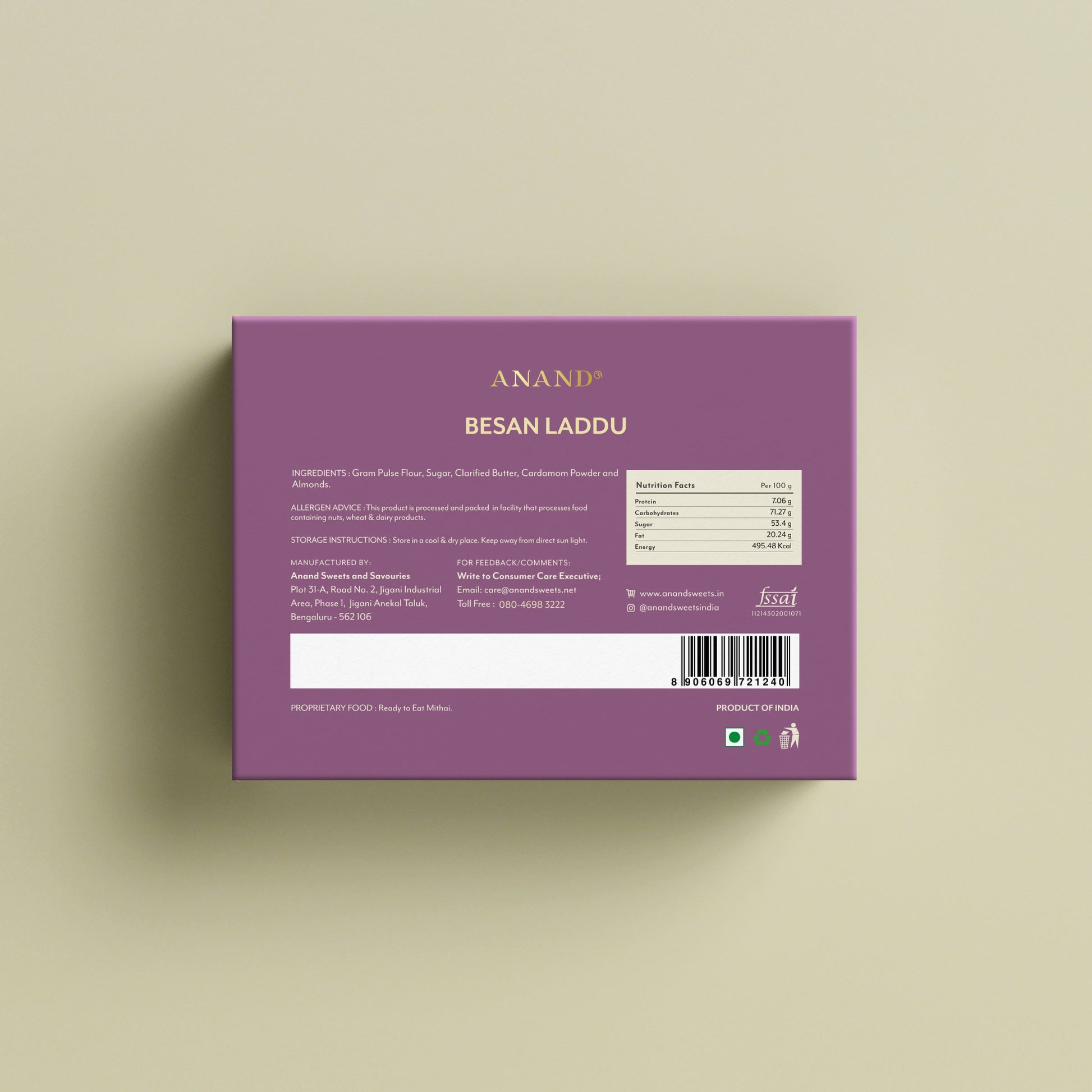 Soft and nutritious, the Anand Sweets Besan Laddus are packed in attractive boxes with the trademark Anand design evoking the ‘taste of royal India’. Stored in an airtight container and kept in a cool, dry place, the laddus stay fresh up to 6 months.