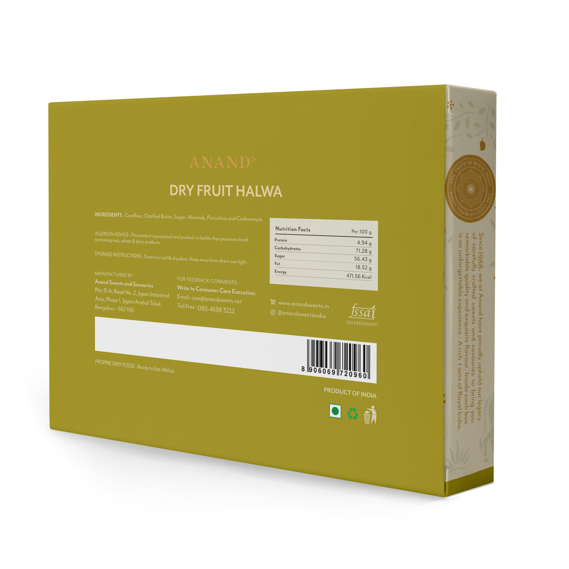 The Anand Sweets Dry Fruits Halwa comes with a soft and spongy texture that combines beautifully with its flavourful nutty taste. The tempting aroma of pure desi ghee holds it all together. Carry along a packet of this almond-topped, brightly coloured sweet as a gift on a special occasion, and your host will be delighted. With zero preservatives, the pretty-looking gourmet sweet is nutritious and easily digested. It is also a delicious energiser.