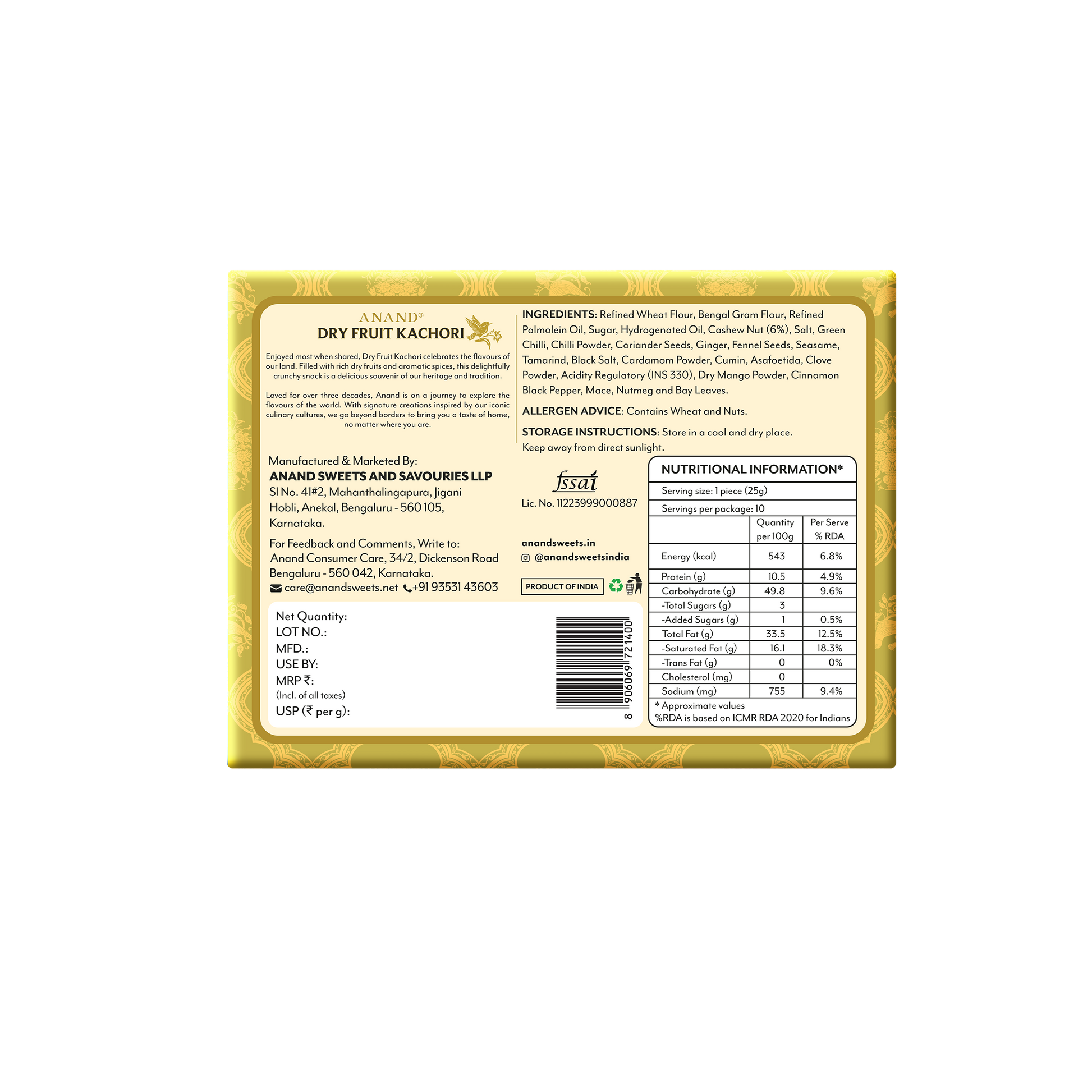 Refined Wheat Flour, Refined Palmolein Oil, Bengal Gram Flour, Hydrogenated Oil, Cashew Nut, Green Gram Dal, Sugar, Salt, Chilli Powder, Coriander Seeds, Black Pepper, Cinnamon, Dry Ginger, Fenugreek Leaves, Nutmeg, Clove, Mace, Cardamom, Caraway & Asafoetida.