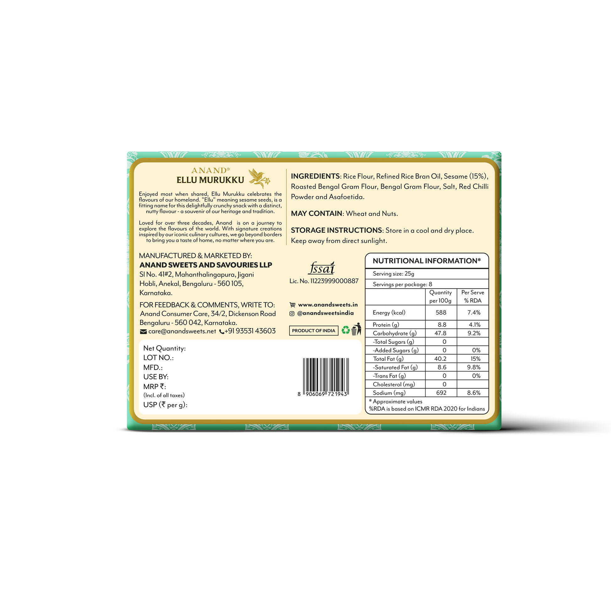 Anand Sweets Ellu Murukku comes in an attractive box decorated with miniature motifs. The packet is tightly sealed to keep the contents crispy. Anand Sweets Murukku has a shelf life of 6 months. Once opened, store the contents in an air-tight container in a cool, dry place away from sunlight.