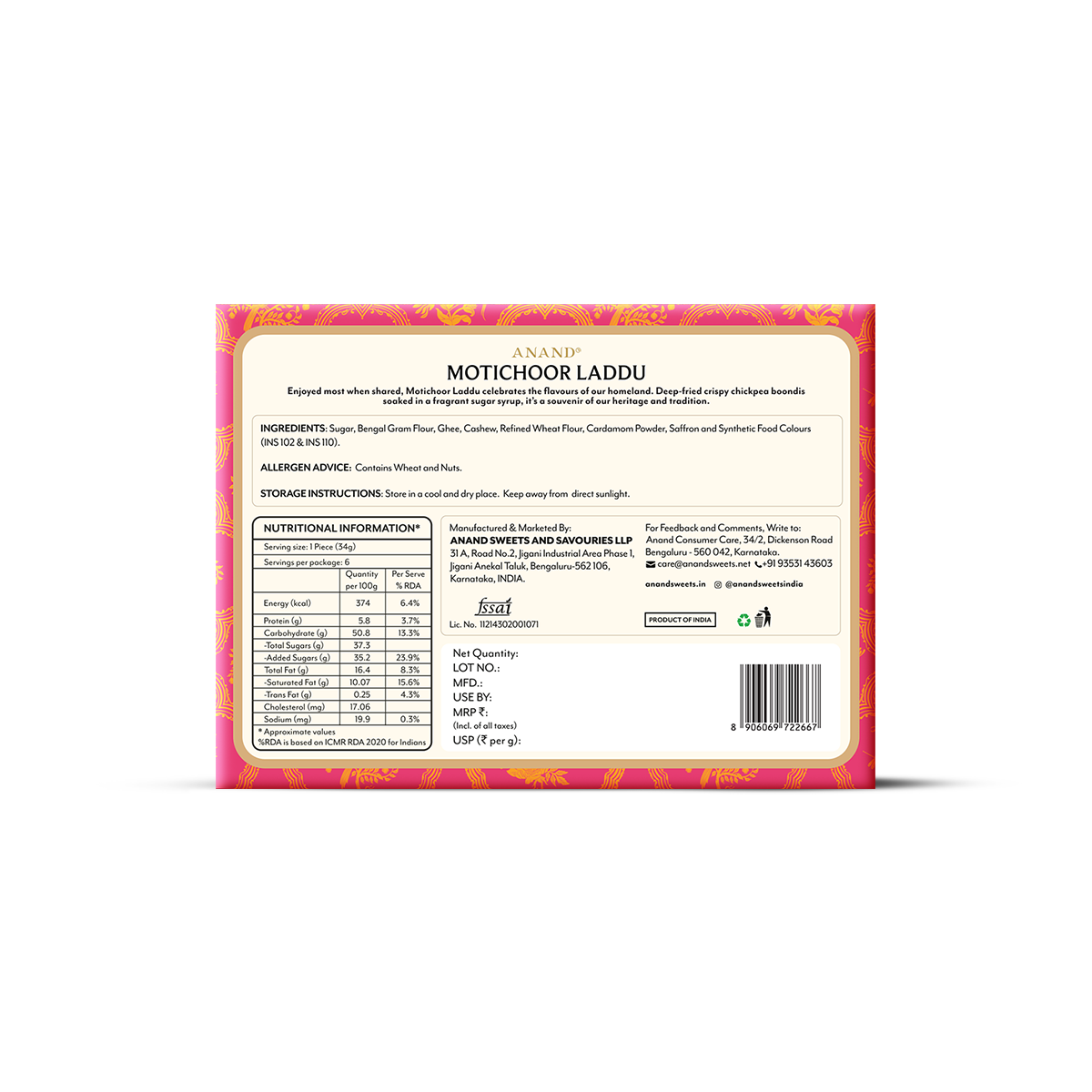 Anand Sweets Motichoor Laddu comes in a tightly-sealed corrugated box that keeps it flavourful and fresh. Once opened, store the box in a cool, dark place or refrigerate and consume the laddus within 15 days from date of purchase.