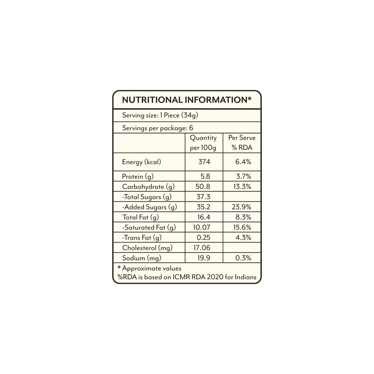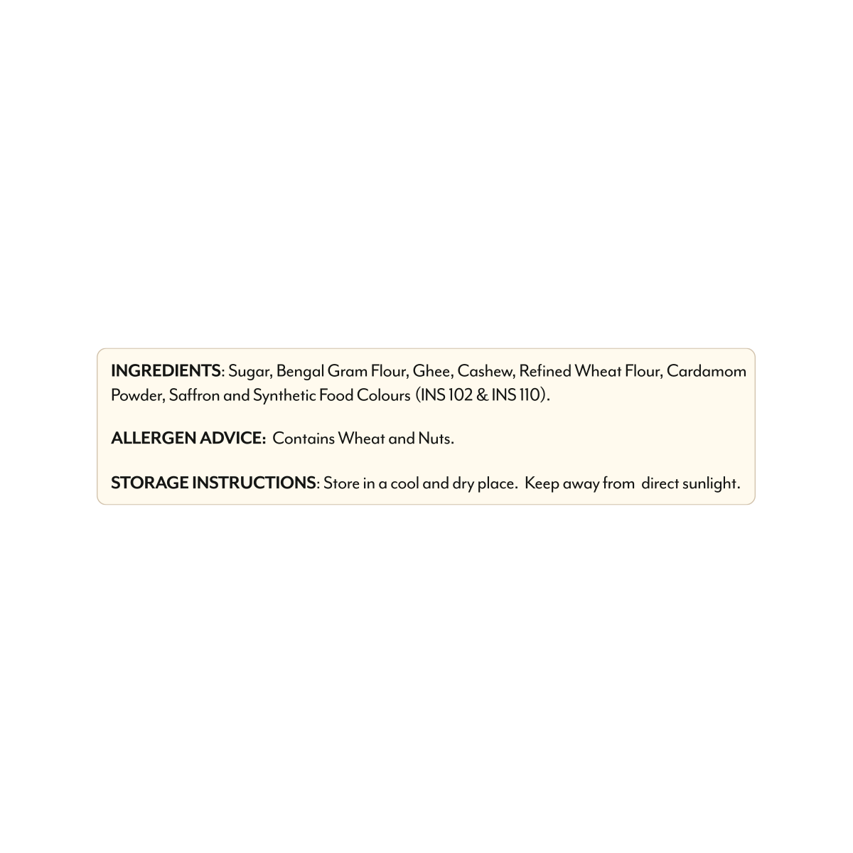 Bengal Gram Flour, Sugar, Ghee, Refined Wheat Flour, Cardamom Powder, Safron and Synthetic Food Colour (INS 102, INS 110).