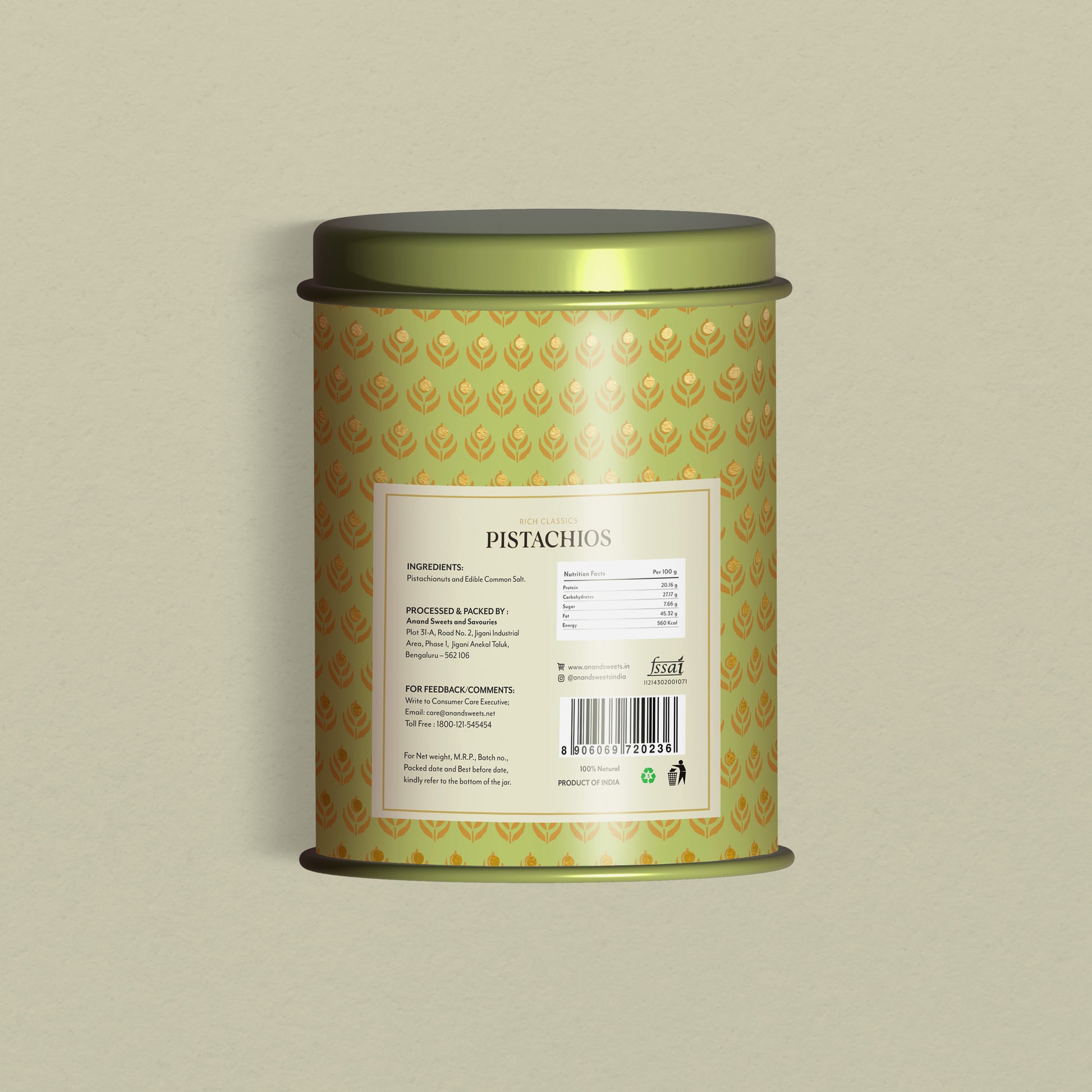Anand Sweets Pistachios come in an attractive tin container that is sealed to keep moisture out. Once opened, remember to keep the lid shut tightly to keep the crunchiness of the pistachios intact. Refrigerate, if you like.