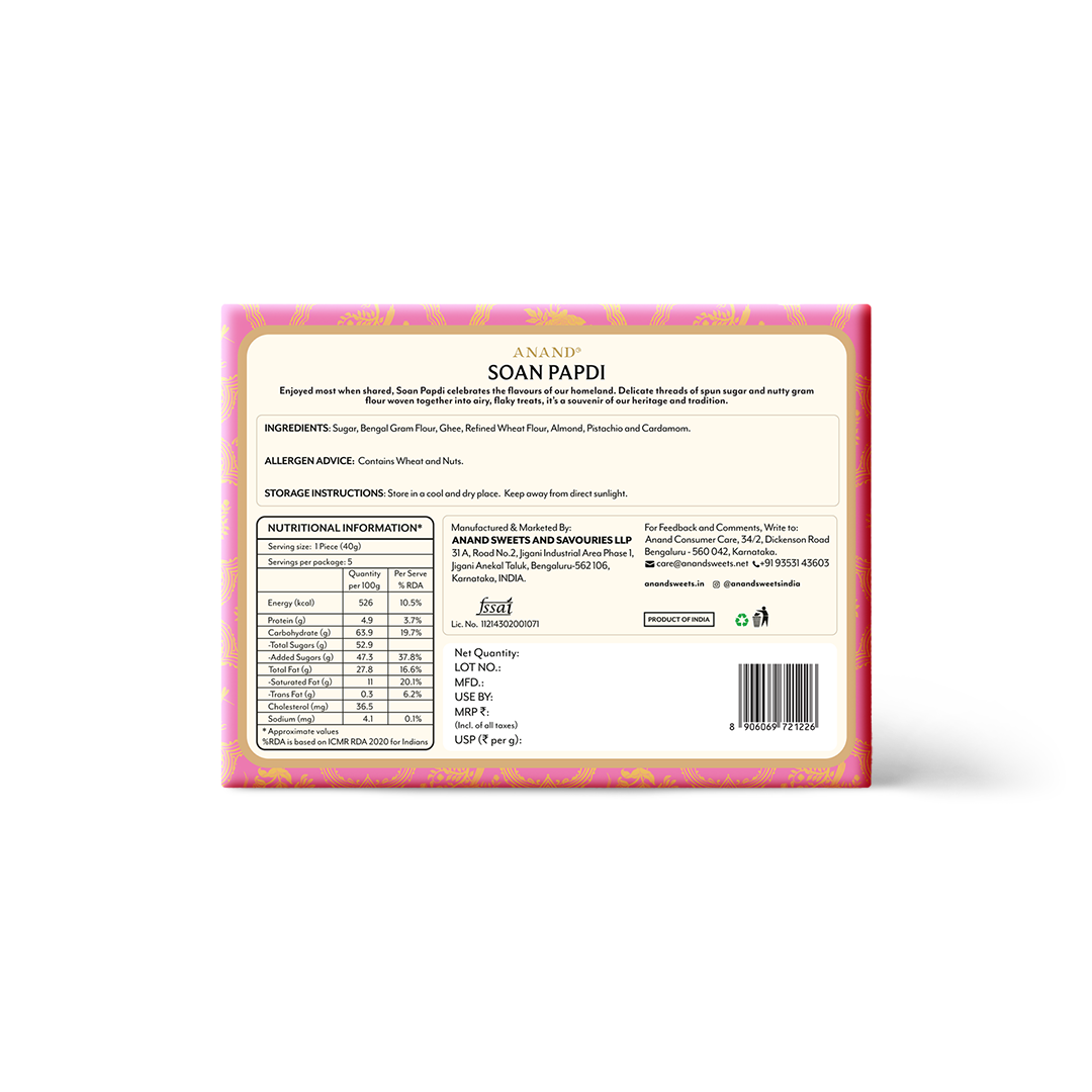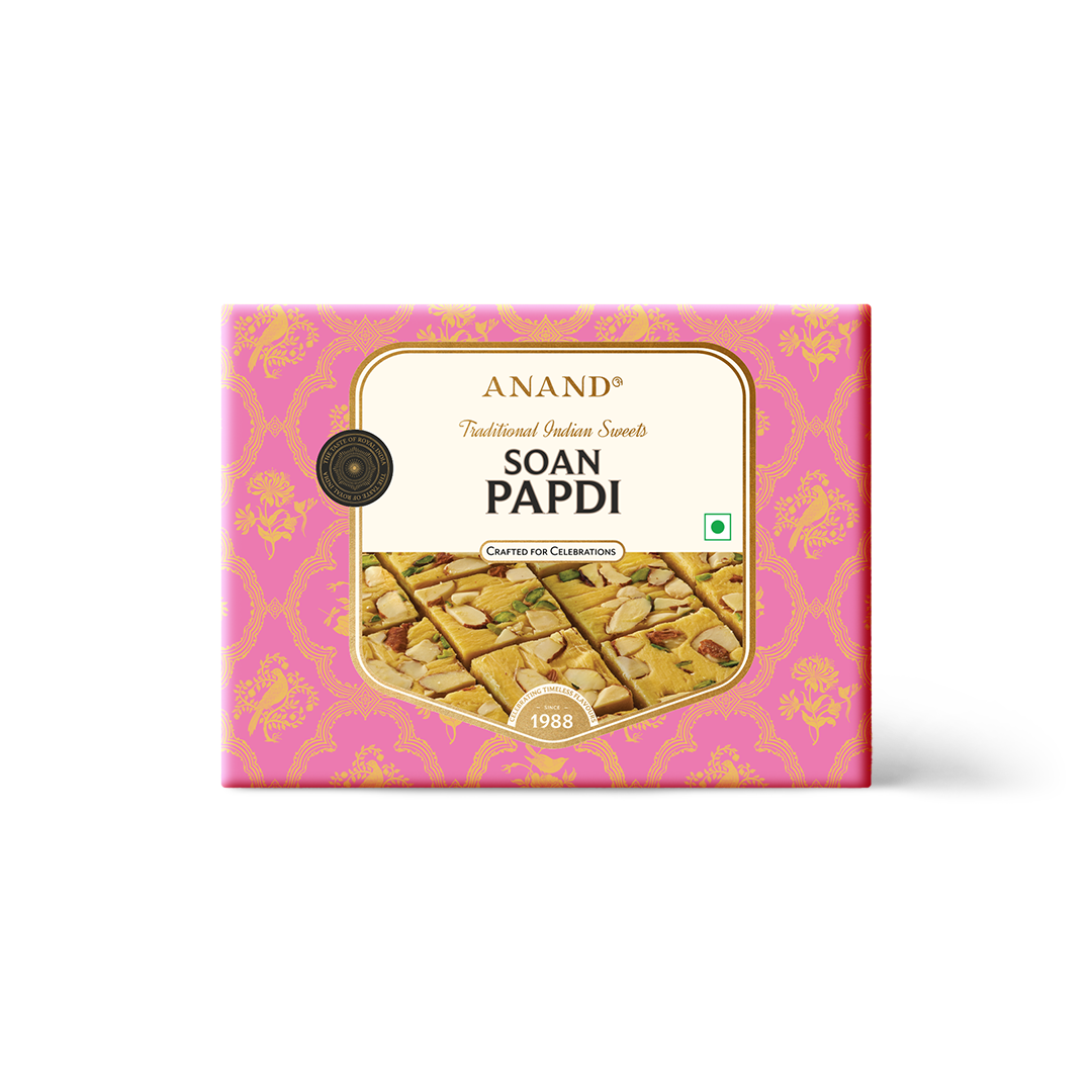 The generous use of desi ghee and painstaking preparation ensures the popular sweet has a shelf life of 6 months. Place in an air-tight container, and store in a cool, dry place. The festive packaging makes the Anand Sweets Soan Papdi stand out.