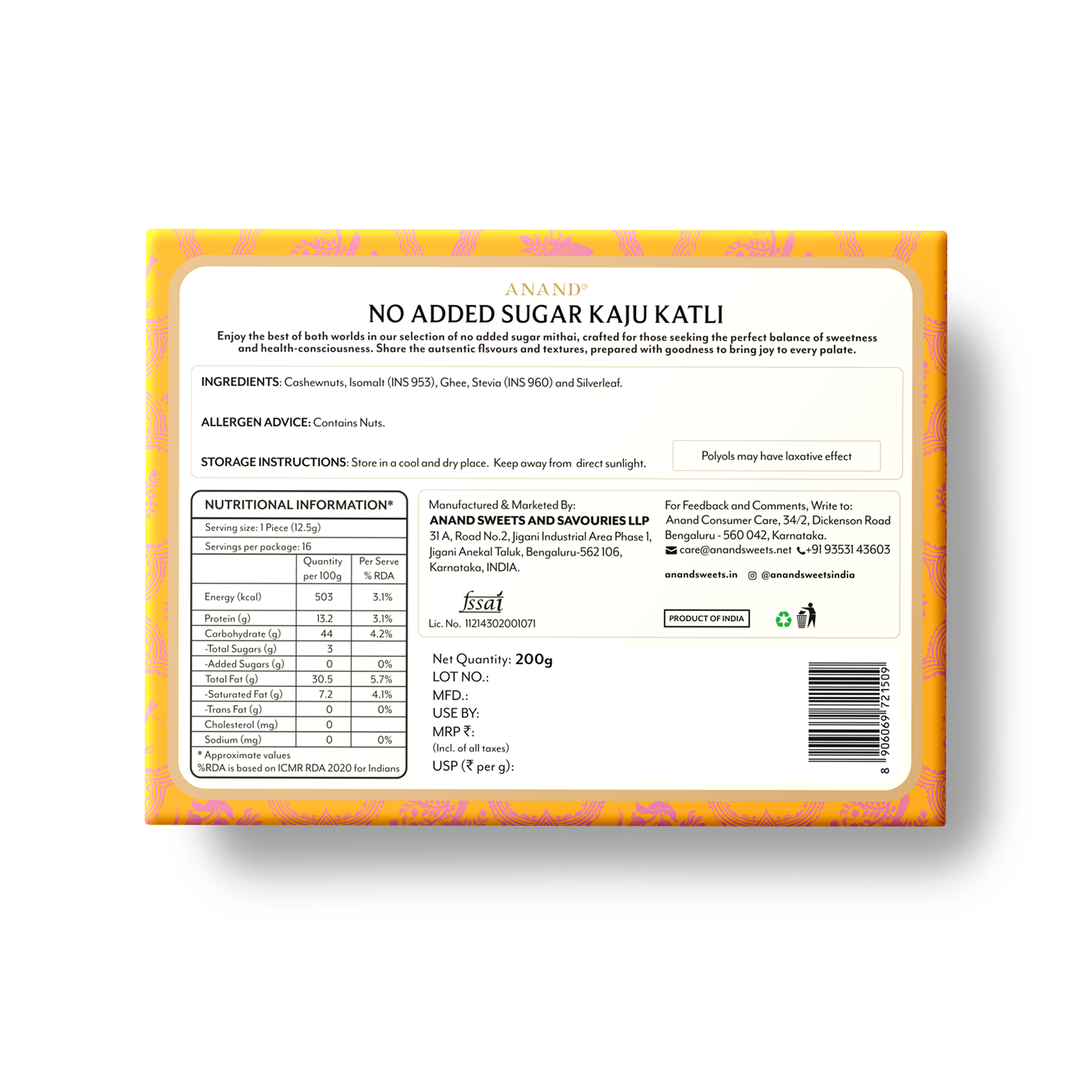 The Anand Sweets Sugar Free Kaju Katli comes packed in a dainty cardboard box with delightful motifs evoking the grandeur of royal India. The cashew fudge is best eaten within 20 days of opening the box. Store the box in a cool, dry place and away from direct sunlight.